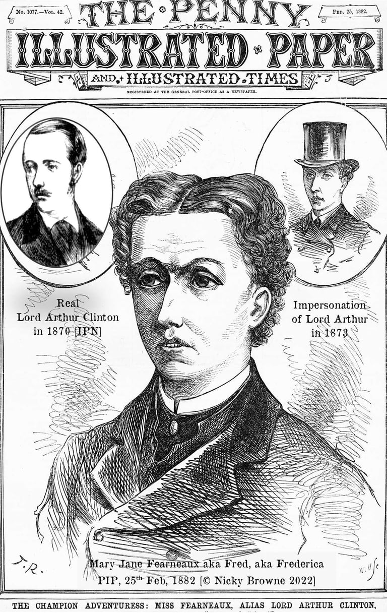 Here, as Frederica de Fearneaux, she impersonates Lord Arthur Clinton, an aristocrat disgraced in the Boulton and Park cross-dressing scandal. This ex-MP, a childhood friend of Royalty, had died of fever in suspicious circumstances. Letters from Queen Victoria command 'he' lives as a woman until her displeasure has passed, and she dresses as a man to raise money from local tradesmen. When they grow impatient, she forges guarantees from the Lord Chief Justice. She becomes 'engaged' to her landlady's daughter, and moves to Liverpool in 1878, but Jennie must return when the money runs out.